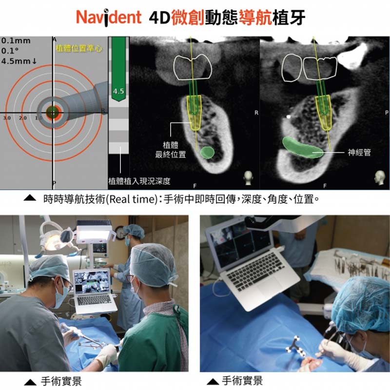 最新牙科導航儀,只需讓病患拍攝一次的斷層掃描,避免過量的輻射劑量,就能利用最先進的時時導航技術(Real time)讓醫師能夠及時掌握植體在牙脊中的深度與角度,避免傷害到上顎鼻竇腔與下顎的神經管,進而縮小手術開刀範圍,達到真正的「微創植牙」,相對也大幅降低術後的疼痛與腫脹感,是為害怕植牙病患的一大福音。