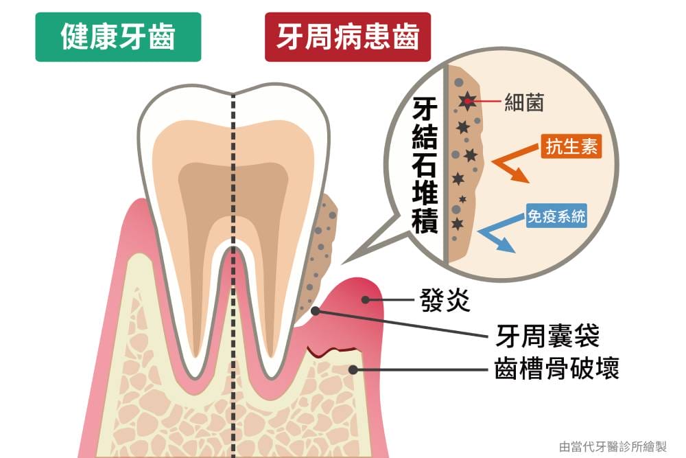 ▲健康牙齒 v.s. 牙周病牙齒結構剖析示意圖