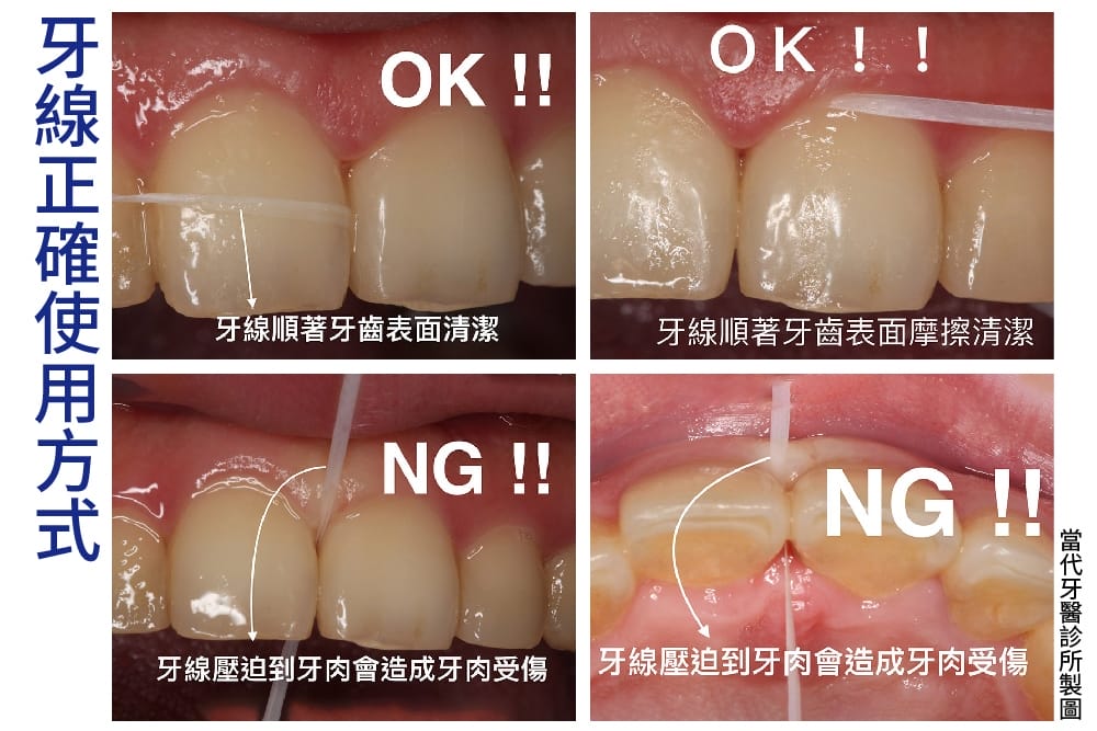 正確的刷牙方式是要使用牙刷、牙線和牙間刷,把牙齒的每個面都清潔乾淨。但一般人即使有習慣使用牙線,也常鬧NG。最常見的是因為牙線壓迫到牙肉導致牙肉受傷;正確做法是要讓牙線順著牙齒表面磨擦清潔。另外,牙周病患者因為牙縫比較大,牙醫師建議必備牙間刷,因為牙周病的牙齒在鄰接面處,有時會有明顯的凹陷,一般牙線無法完全清潔徹底。