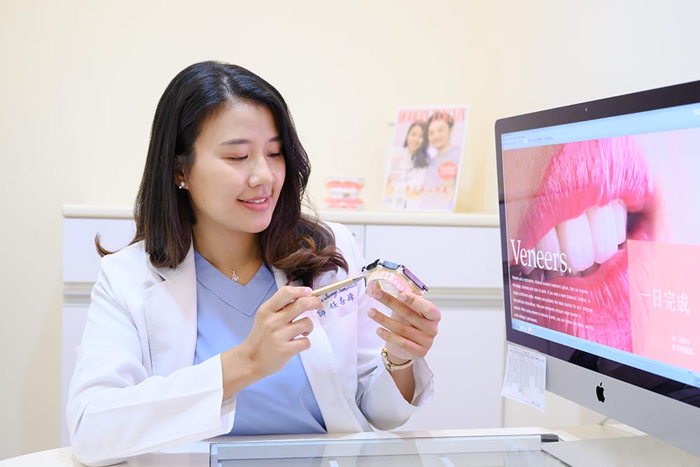 像是因為喝茶而導致的色素暗沉,可利用物理性「噴砂美白」,也就是利用高壓粒子去除牙齒上外來的色素,恢復牙齒的原色,或是化學性「冷光美白」使用氧化劑分解牙齒的色素分子;但若是填補物範圍過大,牙齒缺角、形狀不滿意,則可以直接利用牙齒貼片來覆蓋泛黃的牙齒,並同時改變牙齒的形狀及微調排列。