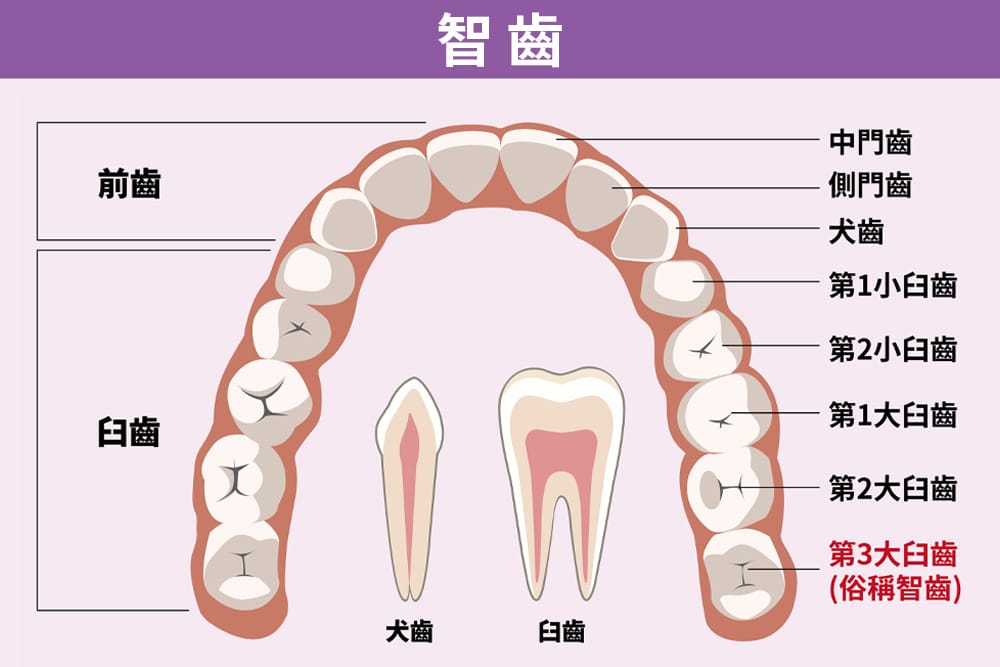 當代牙科醫療體系當代牙醫診所醫師洪君豪表示,大家提到的智齒其實學名為第三大臼齒,位在於口腔內最末端的位置,從大門牙往內算起的第八顆牙齒,上下左右各一顆,總共是四顆,通常在18至20歲時萌發出來。由於智齒的萌發的位置不良,加上顎骨空間的不足,時常有阻生無法正常萌出的情形發生。
