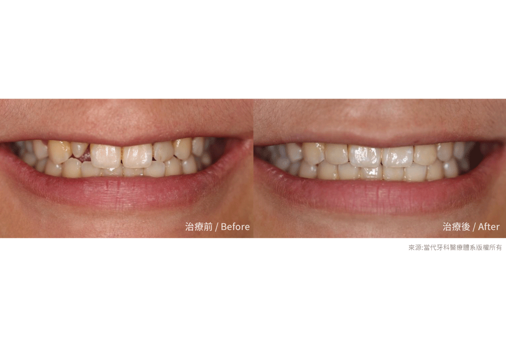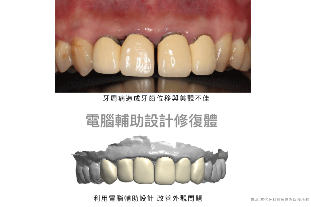 牙周病為國人常見的口腔疾病,患者容易併發或牙齦萎縮、牙縫變大等美觀問題。針對有齒列不整或牙齒美觀問題,建議先進行牙周檢查與牙周病控制,再評估是否適合接受牙科矯正療程。牙周美學相關手術,也能改善部分牙齒長短不協調的問題。若因牙周病導致齒槽骨破壞嚴重時,上述的治療方案可能受限,此時評估以數位化全瓷貼片修復,也可能改善患者美觀問題,並且具有快速、高品質、美觀等特色。