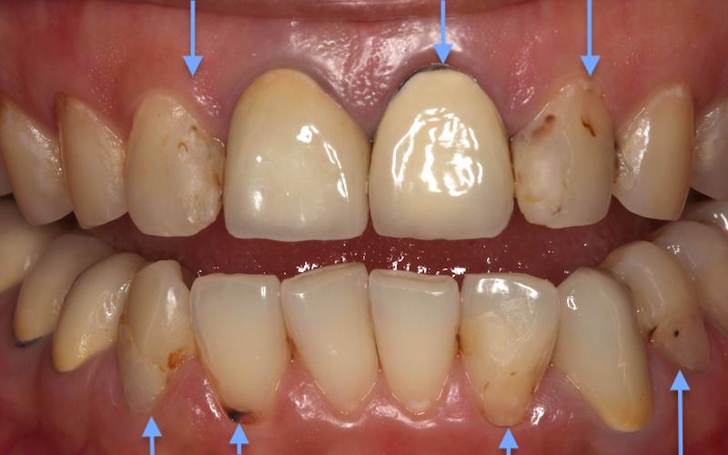 除了很多蛀牙,牙齦萎縮造成牙根外露,可能都是造成牙齒敏感酸痛的原因。除了診斷齲齒蛀牙以外,也使用牙周探針配合X光片,特別檢查患者的牙周狀況是否有潛在風險。診斷結果是全口輕微牙周炎,因此改善牙齒酸痛敏感症狀,也施以定期半年牙結石清除並且改善口腔衛教,患者順利地完成牙周維護。