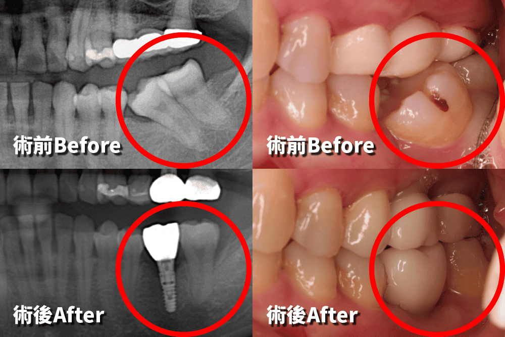 個案初診時的問題有兩個,第一是左邊下顎後牙區,很容易塞食物,牙齦常常會不舒服;第二則是在左邊上顎後方的假牙周圍,牙齦很容易流血。從口內的檢查和全口的X光片檢查,發現左下區域很早第一大臼齒就缺牙。因為缺牙不補,久了以後齒列空間改變,後面兩顆臼齒往前傾倒,造成吃東西時食物堆積難以清潔的問題。