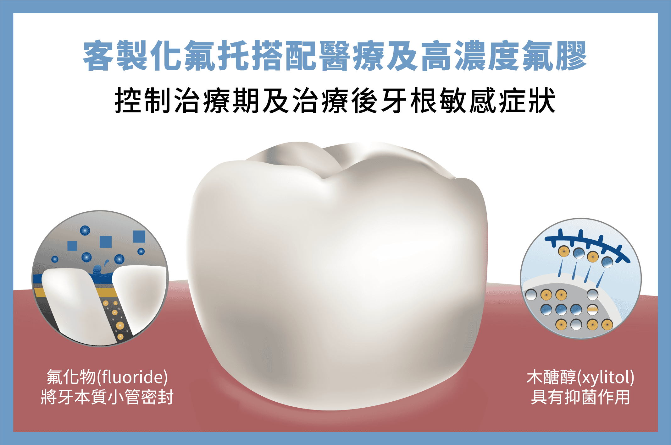 在牙周病初階治療後,深度牙結石被清除,常容易出現局部牙齒敏感、齒間縫隙、牙根裸露等情況。葉立維表示,會提供病患客製化多功能牙托於牙周維護階段使用,內含醫療級高濃度氟膠的牙托,能夠控制治療期及治療後牙根敏感症狀,還能防止牙根齲齒,同時避免治療期及重建前過渡期因缺牙導致牙齒位移。