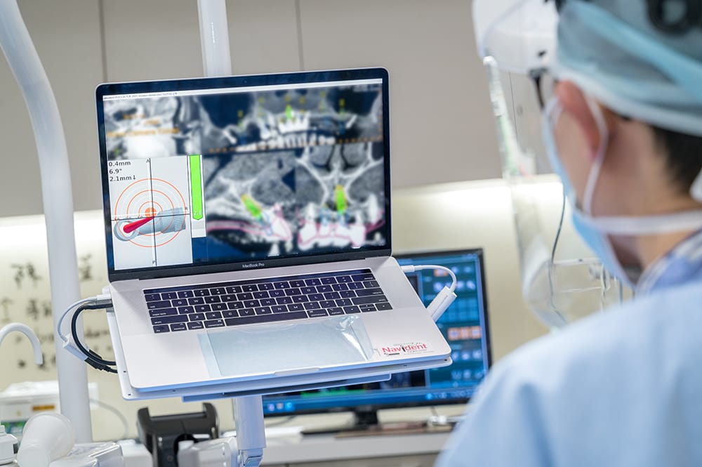但不論是傳統植牙、手術導引板或後來發展的一日全口重建,術前都需評估患者齒槽骨條件。4D動態導航植牙系統在一日全口重建植牙流程中,透過軟體在3D電腦斷層上確認植體位置及擬定治療計畫,再將牙齒的立體斷層與全口掃描的影像疊合,在實際操作過程中,能看清齒槽神經、鼻竇腔和血管位置,在手術前、中、後各階段即時輔助,精準掌控植體深度、角度、位置,大幅提升植牙安全性。