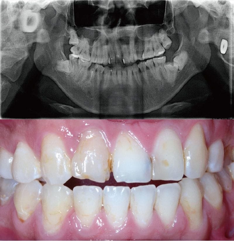圖示:療程前Mr.Su前牙美觀區域的環口式X光片與口內檢查對比照