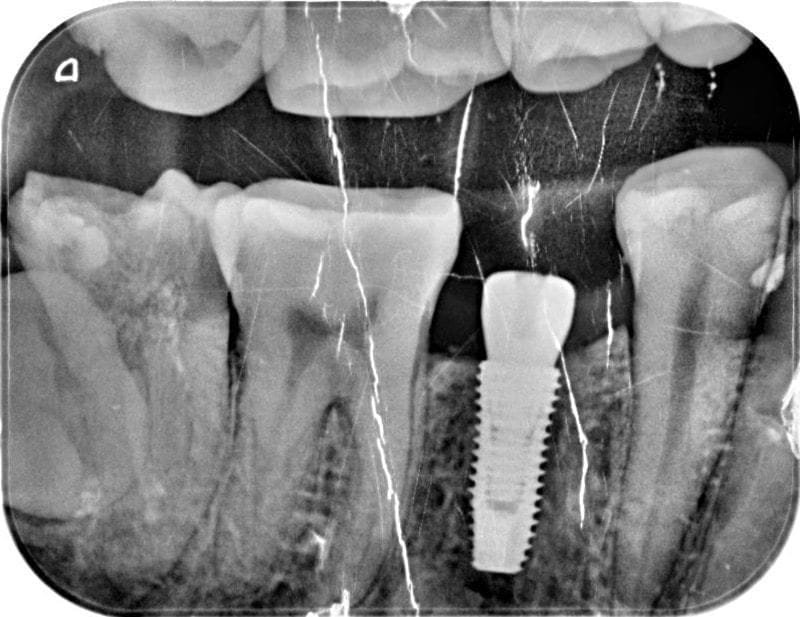植牙手術順利且植體穩定度很好,因此以一階段的方式完成,通常這樣大約兩個半月到三個月等待骨整合完成,就可以進入到製作植牙假牙的步驟。