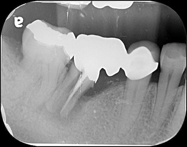 雖然她的症狀跟牙周病有點類似,但我們在局部的X光片可以明顯看到她右下的大臼齒牙根已經明顯有縱向斷裂。通常這樣細菌會累積在裂縫處,造成局部牙齦發炎和齒槽骨破