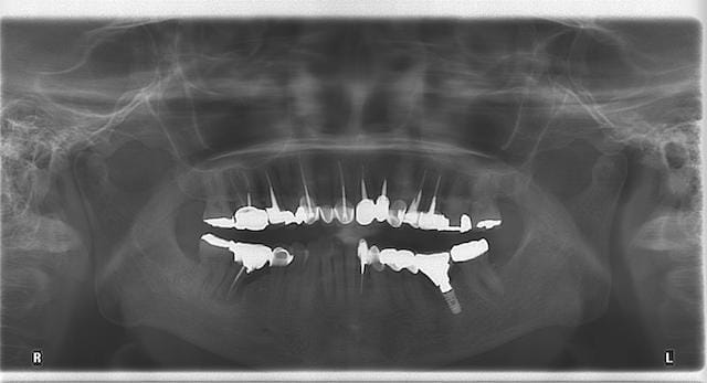 圖示:由Mrs.Hsieh的全口X光片中,也可看出口內有多顆假牙,且多顆牙齒做過根管治療