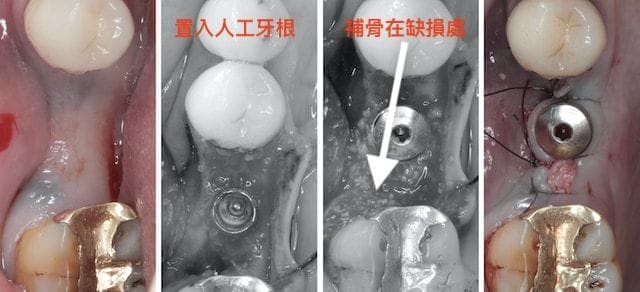 圖示:人工植牙手術修補缺牙。由左至右依序為:術前 / 置入人工牙根 / 植牙前補骨 / 鎖上癒合帽後縫合
