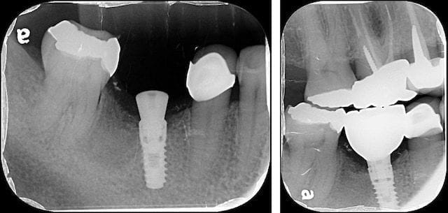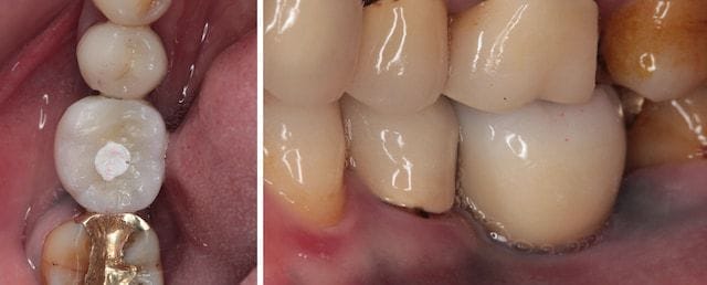 圖示:採人工植牙手術修補缺牙,左為人工牙根置入後,右為鎖上全瓷冠植牙假牙
