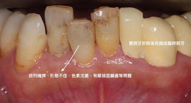 圖示:前牙治療前狀況,有前牙排列不整、鄰接面蛀牙的問題,且假牙邊緣不密合,先拆除換為臨時假牙