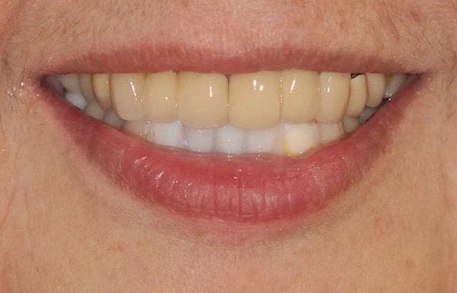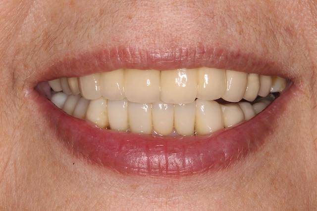 從全口的照片也可以發現,她因為蛀牙率很高,早期看牙的經歷很多,口內有將近20顆假牙,並且很多顆牙齒做了根管治療。