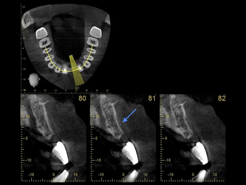 植牙補骨前電腦斷層檢查,箭頭處顯示骨頭寬度不足