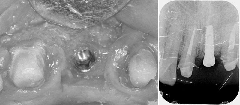 植牙手術置入人工牙根,右為置入人工牙根後拍攝的X光片,確認人工牙根位置符合治療計畫