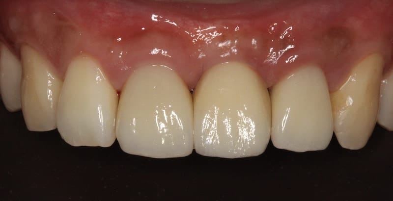 第二階段植牙手術,我們同時應用牙冠增長術,調整兩顆鄰牙的牙肉和齒槽骨高度,讓每顆牙齒在未來的最終假牙的長度、寬度比例能夠符合黃金比例(1.618:1)。植牙的位置與深度角度是最重要的,放在最好的位置才能使未來的每顆牙齒的相對關係能夠和諧美觀、長久耐用。整個療程也很順利在舒眠鎮靜下的狀態完成。