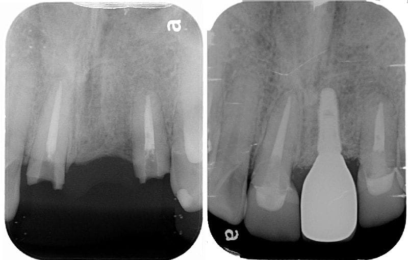 圖示:人工植牙手術前後X光片比較:(左)假牙拆除後,可見缺牙處兩邊的支柱牙結構破壞嚴重;(右)人工植牙手術後,完成全瓷冠假牙