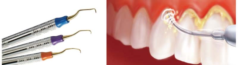 • 使用牙周刮刀深入牙周囊袋內﹐由牙醫師靠觸覺感受牙根表面的牙結石並去除。